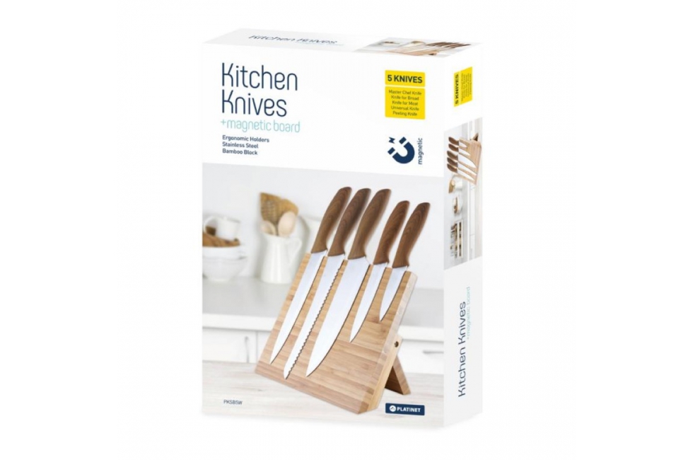 Ένα σύνολο πέντε μαχαιριών με τις εργονομικές λαβές και μια μαγνητική στάση μπαμπού. Το σετ περιλαμβάνει: 1 - Μαχαίρι σεφ - ιδανικό για κοπή κρέατος ακριβείας, φρούτα και λαχανικά. 2 - Μαχαίρι ψωμιού - μια οδοντωτή λεπίδα με προφίλ εξασφαλίζει εύκολη κοπή ψωμιού και κέικ χωρίς σύνθλιψη. 3 - Μαχαίρι για το κρέας - θα είναι χρήσιμο κατά την κοπή όλων των τύπων κρέατος και ψαριών. 4 - Universal μαχαίρι - για γενικές εφαρμογές. 5 - Μαχαίρι απολέπισης - ιδανικό για ακριβή κοπή και απολέπιση. ΥΨΗΛΗ ΠΟΙΟΤΗΤΑ ΑΠΟΔΟΣΗΣ Το σετ μαχαιριών κουζίνας Platinet είναι κατασκευασμένο από υλικά υψηλής ποιότητας. Οι αιχμηρές λεπίδες φιασμένες από υψηλό - ποιοτικό ανοξείδωτο εξασφαλίζουν την ακριβή κοπή και την υψηλή διάρκεια. Η ξύλινη λαβή επιτρέπει μια άνετη λαβή. Η στάση μπαμπού έχει μια μαγνητική επιφάνεια που το καθιστά ευκολότερο να αποθηκεύσει τα μαχαίρια. |