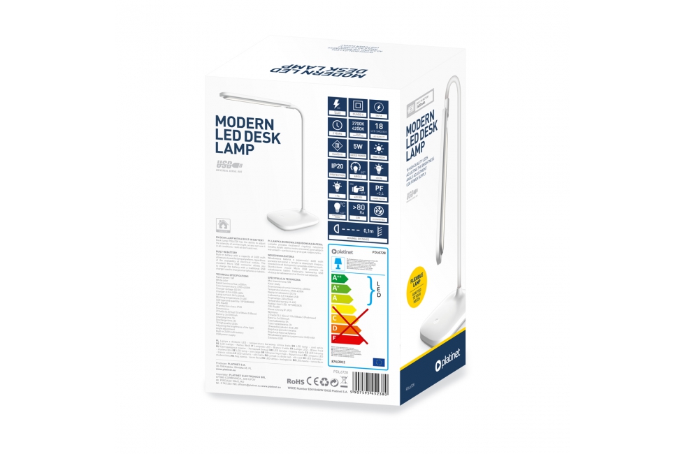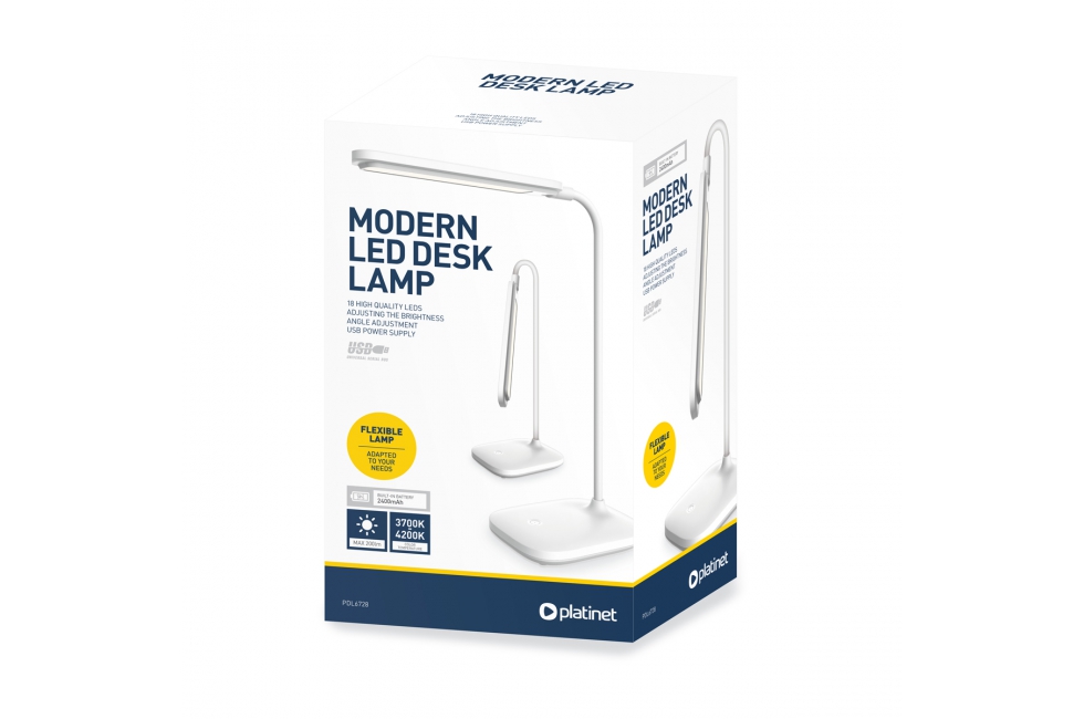 Περιγραφή ΒΑΣΙΚΑ ΧΑΡΑΚΤΗΡΙΣΤΙΚΑ 18 υψηλής ποιότητας LED ΠΡΟΣΑΡΜΟΣΜΈΝΟ ΣΤΙς ΑΝΑΓΚΕΣ ΣΑΣ Ο λαμπτήρας γραφείου PDL6728 έχει τη δυνατότητα να ρυθμίσει την ένταση του εκπεμπόμενου φωτός, έτσι μπορείτε να το χρησιμοποιήσετε σε όλες τις συνθήκες - και στην εργασία και στο υπόλοιπο. ΕΝΣΩΜΑΤΩΜΈΝΗ ΜΠΑΤΑΡΊΑ Η ενσωματωμένη μπαταρία χωρητικότητας 2400 mAh σας επιτρέπει να χρησιμοποιείτε τη λάμπα οπουδήποτε, ανεξάρτητα από τη διαθεσιμότητα των ηλεκτρικών πτηκών. Ο τυπικός σύνδεσμος Micro USB σάς επιτρέπει να φορτίζετε την μπαταρία με έναν παραδοσιακό φορτιστή USB που χρησιμοποιείται για τη φόρτιση smartphone ή tablet. ΤΕΧΝΙΚΕΣ ΠΡΟΔΙΑΓΡΑΦΕΣ Εκτιμημένη δύναμη: 3.6W |