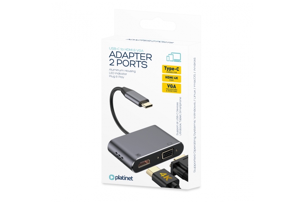 DescriptionUSB C to HDMI adapter PRACTICAL SOLUTION The adapter will allow you to connect projectors or external monitors to modern ultrabooks equipped with only a USB type C connector. COMFORTABLE CONSTRUCTION The compact, elegant and lightweight design of the adapter makes it the perfect complement to your laptop, which you can easily take with you anywhere. TECHNICAL SPECIFICATIONS Support for HDMI 4K @ 30Hz, 1080P @ 60Hz; VGA: 1080P*60Hz Aluminum housing Plug & Play Support HDMI and VGA port working at the same time |