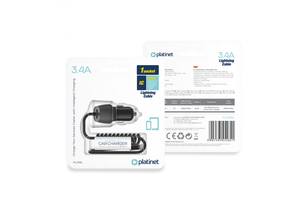 Car Charger Platinet Spiral 3.4A USB + Lightning Cable