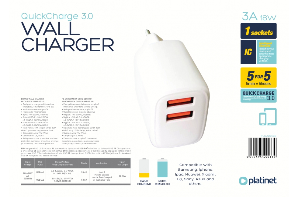 DescriptionWall charger with fast charging function Quick Charge 3.0. It allows you to reach up to 80% of the battery charge in as little as 35 minutes. TECHNICAL SPECIFICATIONS - designed to charge mobile devices: smartphones, tablets, GPS, etc. - Power: 18W - Maximum current: 3A - High quality non-flammable housing - Input: 100 = 240VAC, 50 / 60Hz - Output: 5V / 3A, 9V / 2A, 12V / 1.5A - Dimensions: 45 x 92 x 27mm - Short Circuit Protection, OVP, OCP |