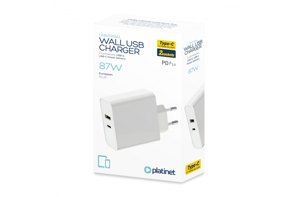 PLATINET WALL CHARGER 87W TYPE-C PD 87W + USB-A 12W |
